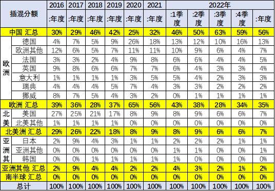 2022年的世界新能源車(chē)結(jié)構(gòu)是中國(guó)偏純電動(dòng)。歐洲主力國(guó)家市場(chǎng)插混較強(qiáng),歐洲市場(chǎng)結(jié)構(gòu)的純電與插混持平的特征明顯,挪威等非汽車(chē)生產(chǎn)國(guó)家的純電動(dòng)較強(qiáng)。