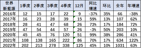 *2022年世界新能源乘用車(chē)走勢(shì)較強(qiáng),1-12月達(dá)到1031萬(wàn)臺(tái),同比增長(zhǎng)63%。其中12月銷(xiāo)量125萬(wàn)臺(tái),同比增長(zhǎng)45%。