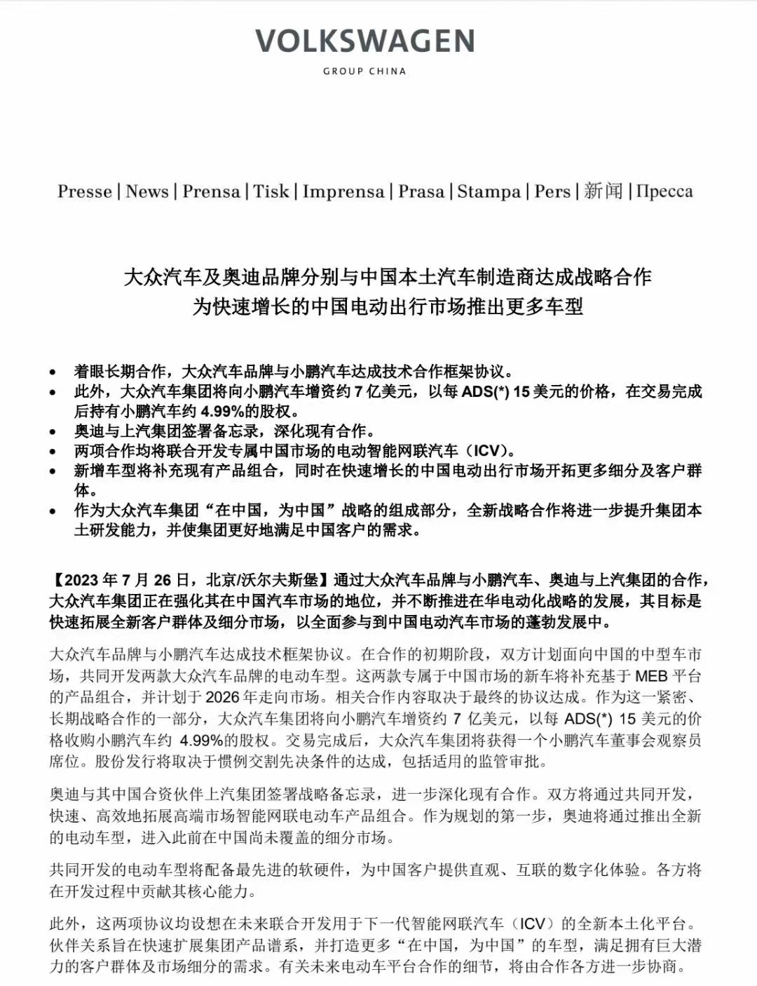 在新車“上市即熱銷”的同時,小鵬還曝出了另一條讓所有人都出乎意料的“大新聞”——7月26日,該品牌與大眾汽車同時宣布:雙方已達成技術框架協(xié)議,將面向中國的中型車市場,共同開發(fā)兩款大眾汽車品牌的電動車型,并計劃于2026年推向市場。