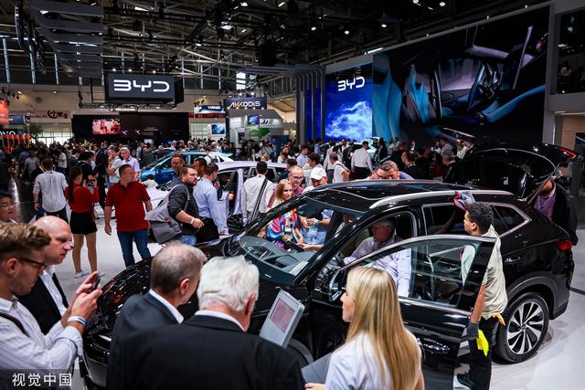 當(dāng)?shù)貢r間2023年9月6日,在德國慕尼黑舉行的2023國際車展上,參觀者在觀看中國汽車品牌比亞迪的新能源汽車。@視覺中國