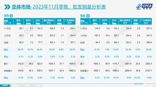 11月,國內(nèi)狹義乘用車生產(chǎn)、批發(fā)、零售端皆呈現(xiàn)同環(huán)比雙增長的有力表現(xiàn),并連續(xù)第三個月齊齊站上200萬輛關(guān)口。1-11月,狹義乘用車生產(chǎn)、批發(fā)、零售累計增速繼續(xù)擴大,分別達到7.4%、8.9%和5.3%,較1-10月各自提升1.9、1.7和2.1個百分點。