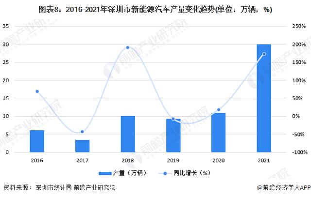 近年來,深圳市新能源汽車產(chǎn)業(yè)發(fā)展迅猛。2018-2020年,深圳市新能源汽車產(chǎn)量維持在9萬輛/年以上,2020年突破了10萬輛;2021年,深圳市新能源汽車產(chǎn)量逼近30萬輛,同比增長174%;同時(shí),在新能源汽車的有效推廣下,全市公交出租均已實(shí)現(xiàn)電動(dòng)化,2021年全市新能源汽車銷量14.48萬輛,占當(dāng)年汽車銷量比重超40%。
