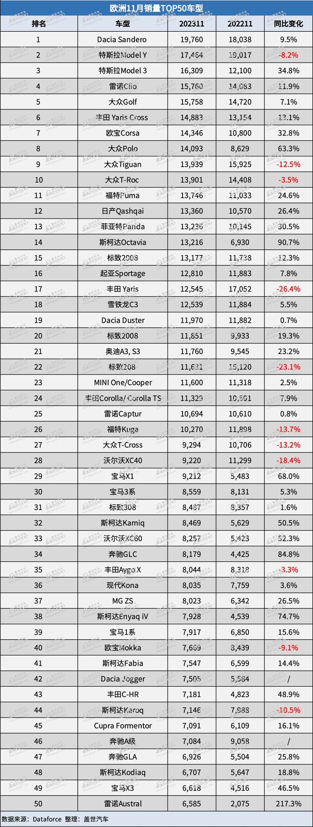 就車型而言,Dataforce的初步數(shù)據(jù)顯示,Dacia Sandero在11月成為歐洲最暢銷的車型。這是該車型連續(xù)兩個月成為歐洲最暢銷的車型,并且在今年1月至11月期間第4次成為月度暢銷車型。