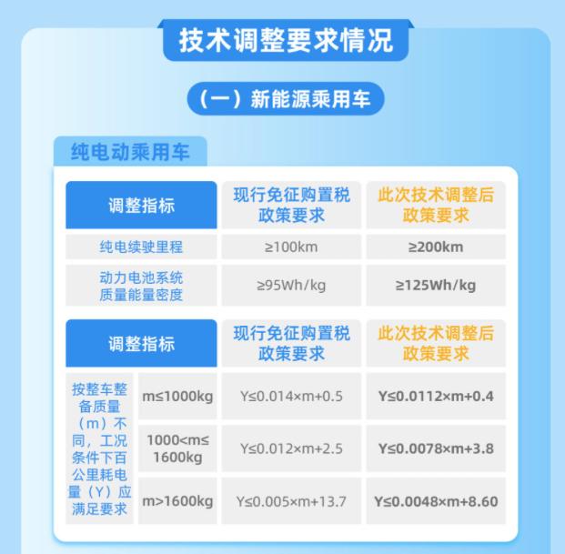 2023年12月11日,工信部、財政部、稅務(wù)總局三部門聯(lián)合發(fā)布《關(guān)于調(diào)整減免車輛購置稅新能源汽車產(chǎn)品技術(shù)要求的公告》(下稱12月最新公告),更新了享受減免車輛購置稅的新能源汽車產(chǎn)品的技術(shù)要求,提升了整車能耗、續(xù)駛里程等多項指標(biāo),明確了換電模式車型的相關(guān)要求。