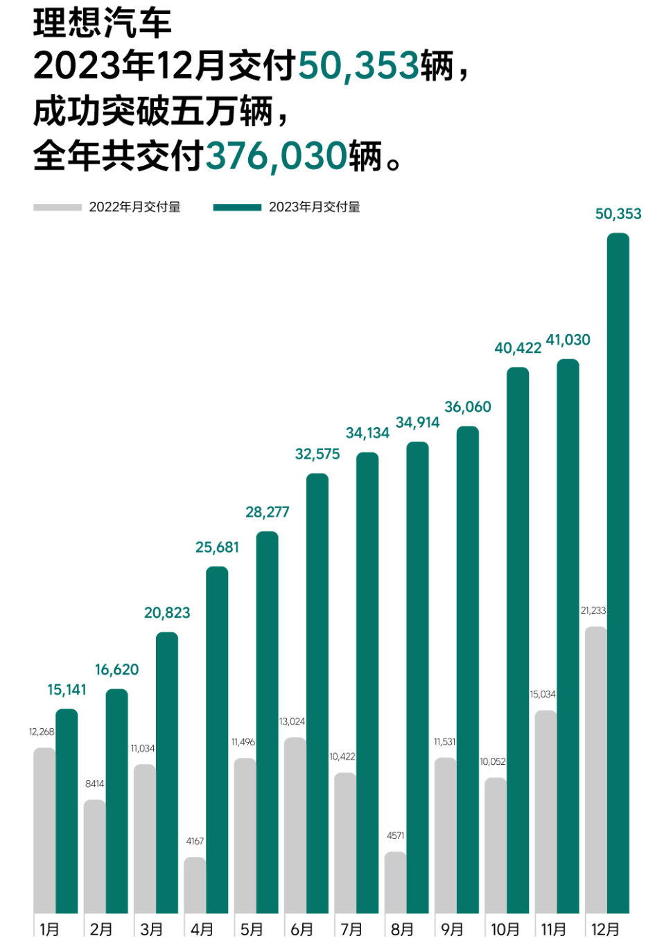 作為新勢(shì)力的代表,理想汽車今年表現(xiàn)也同樣亮眼。其公布的數(shù)據(jù)顯示,2023年12月,理想汽車交付新車5.04萬輛,同比增長137.1%。這也是理想汽車首次月交付超過5萬大關(guān),兌現(xiàn)了CEO李想此前的承諾。整體來看,理想在2023年累計(jì)交付37.6萬輛,同比增長182.2%。截至2023年12月31日,理想汽車?yán)塾?jì)交付量超60萬輛,是交付量最高的新勢(shì)力車企。
