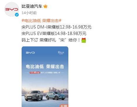 2月29日,比亞迪再出“王炸”。當(dāng)天,比亞迪汽車發(fā)布微博稱,宋PLUS DM-i榮耀版12.98萬—16.98萬元;宋PLUS EV榮耀版14.98萬—18.98萬元。同時(shí),比亞迪還推出B級(jí)轎車“新王炸”——海豹DM-i榮耀版勁爆上市,14.98萬元起。