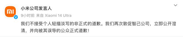 隨后小米公司發(fā)言人又針對前述劉濤的道歉補充說,“我們不接受個人輕描淡寫的非正式的道歉。我們再次敦促智己公司,立即公開澄清,并向被其誤導(dǎo)的公眾正式道歉!”