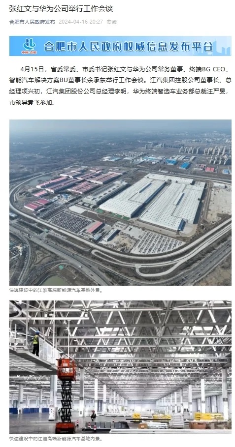 2023年12月,江淮汽車發(fā)布公告稱,與華為終端有限公司簽署《智能新能源汽車合作協(xié)議》。雙方將基于華為智能汽車解決方案,在產(chǎn)品開發(fā)、生產(chǎn)制造、銷售、服務(wù)等多個領(lǐng)域全面合作,著力打造豪華智能網(wǎng)聯(lián)電動汽車。
