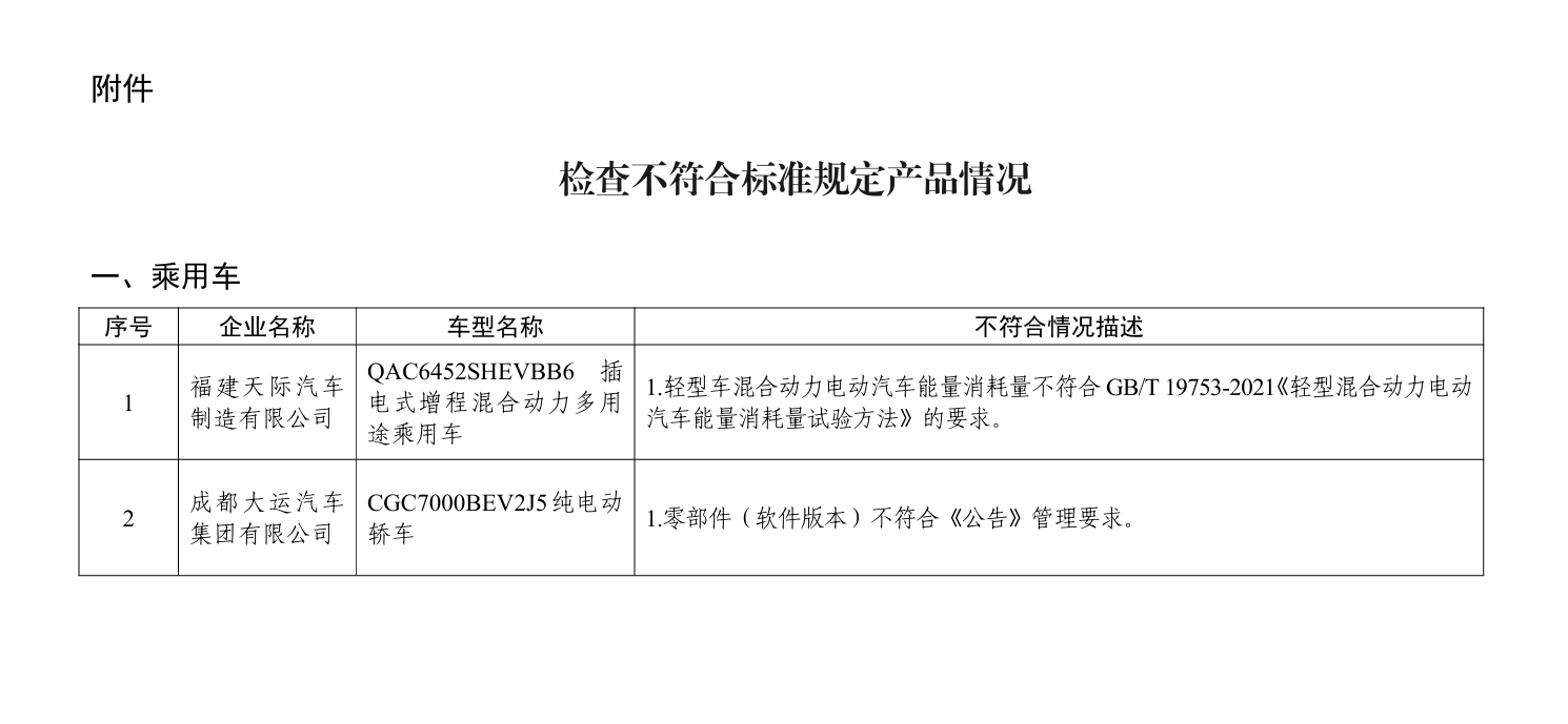 (一)新能源乘用車,共涉及2家企業(yè)的2個(gè)車型產(chǎn)品,涉及電動(dòng)汽車能量消耗量生產(chǎn)一致性不符合標(biāo)準(zhǔn)要求、零部件(軟件版本)不符合《公告》管理要求。