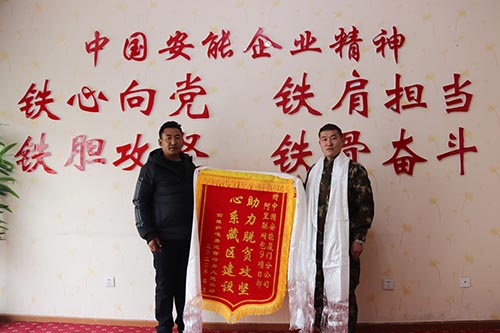 中國電力網訊 4月20日上午,西藏日喀則市薩嘎縣達吉嶺鄉(xiāng)派出所所長旦增扎巴專程來到中國安能第二工程局阿里聯(lián)網線路包9項目部,為全體人員獻上潔白的哈達,為項目贈送了印有“心系藏區(qū)建設,助力脫貧攻堅”內容的錦旗和感謝信,對項目積極承擔央企社會責任、助力脫貧攻堅的作為表示贊賞與感謝。“中國安能為我們幫了大忙,建設阿里聯(lián)網工程為我們送電,為我們解決務工難題,還支持我們建設,我受我們鄉(xiāng)書記委托,專程過來感謝你們,我們達吉嶺鄉(xiāng)全鄉(xiāng)人民都感謝你們!” 他緊握項目經理何樂峰的雙手,動情地說道。