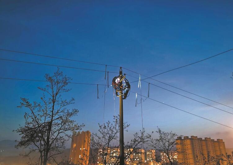 4月13日晚,徽縣供電公司員工在城關(guān)鎮(zhèn)一條10千伏線路的電桿上處理因大風(fēng)造成的線路故障。任毅明 攝