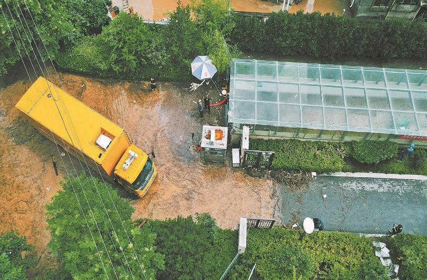 7月17日,受暴雨影響,寶雞渭濱區(qū)瀾湖灣小區(qū)配電房被淹。寶雞供電公司員工為瀾湖灣小區(qū)接入發(fā)電車,恢復(fù)小區(qū)居民用電。呂文博 攝