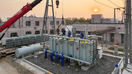 國(guó)網(wǎng)石家莊供電公司工作人員對(duì)220千伏安托變電站主變進(jìn)行更換作業(yè)。胡國(guó)秋攝