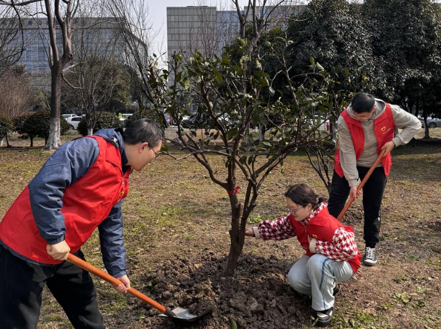 隨后,三方黨支部號召黨員、團員共同踐行“綠水青山就是金山銀山”理念,開展“共植黨員林”植樹活動。身穿紅色馬甲的黨員、團員們彼此團結(jié)協(xié)作、緊密配合,有條不紊的進行著揮楸鏟土、扶苗填坑、提桶澆水等各環(huán)節(jié)作業(yè)。經(jīng)過大家的共同努力,三個黨支部一起種下的“共建樹”在土地上挺立著,“黨建紅”與“生態(tài)綠”交相輝映,呈現(xiàn)出春意盎然、生機勃勃的景象。