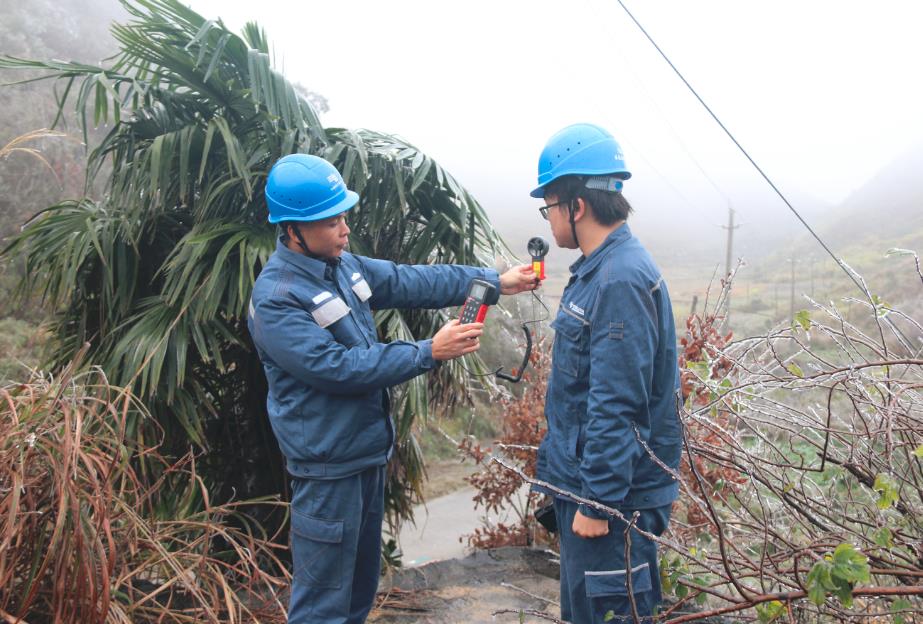 “線路有輕微覆冰,鐵塔塔基穩(wěn)固,螺絲沒有松動。”12月1日,南方電網(wǎng)廣東韶關(guān)乳源供電局陳宇飛等人冒著凍雨來到大橋鎮(zhèn)中沖、三元、紅云等村莊,重點對高海拔地區(qū)、山頂、大風口等特殊地段鐵塔和線路覆冰情況進行巡視檢查,及時處置線路覆冰,確保通電正常。