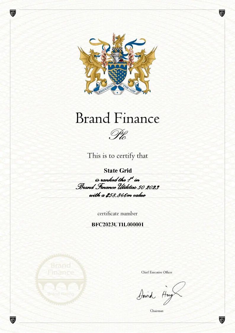 ▲2023年全球公用事業(yè)50強(qiáng)品牌榜首證書
