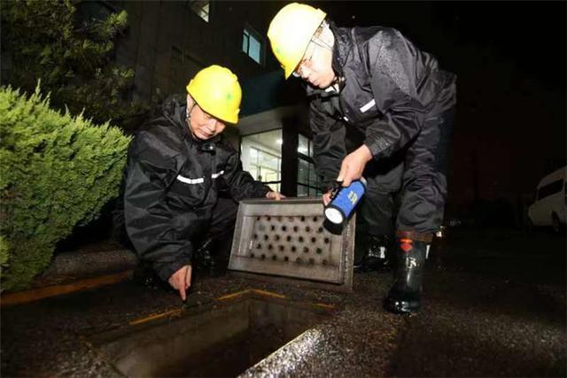 國網(wǎng)江蘇南通供電公司員工冒雨檢查閘口用電設(shè)備,確保安全運行。
