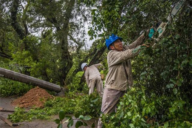 國網(wǎng)福建泉州惠安供電公司員工在被大風壓斷的10千伏虎窟線電桿旁緊急清理樹木障礙。