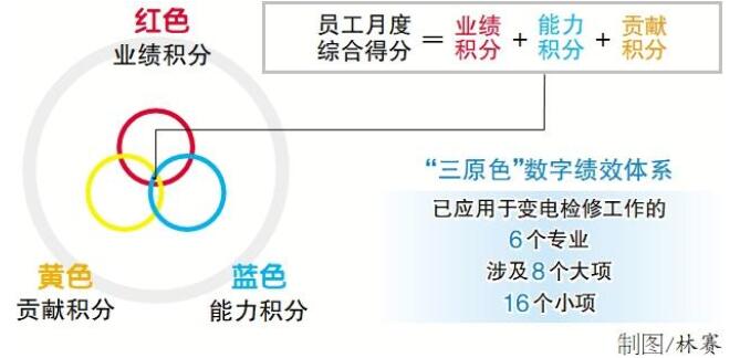 杭州供電公司為適應(yīng)企業(yè)轉(zhuǎn)型升級(jí)要求,樹立“工資靠掙、業(yè)績(jī)靠干”績(jī)效理念,于今年2月8日起在變電檢修中心221名員工績(jī)效考核工作中試點(diǎn)應(yīng)用“三原色”數(shù)字績(jī)效體系。紅、藍(lán)、黃三原色分別代表衡量工作量的業(yè)績(jī)積分、衡量工作能力的能力積分和衡量貢獻(xiàn)大小的貢獻(xiàn)積分。其中,業(yè)績(jī)積分又分為安全積分和工單積分。每名員工每個(gè)月的綜合得分都由該中心的績(jī)效管理員基于業(yè)績(jī)、能力、貢獻(xiàn)三個(gè)維度計(jì)算得出,以實(shí)現(xiàn)薪酬多勞多得、能者多得。