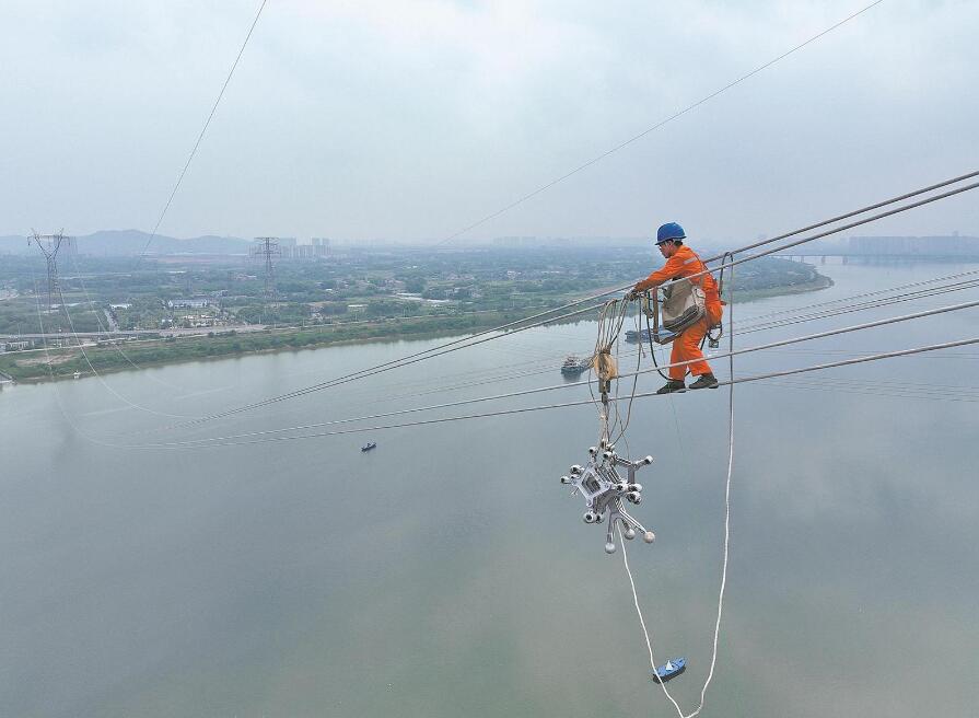 國網(wǎng)山東電力員工在白鶴灘—浙江±800千伏特高壓直流輸電線路開展走線驗(yàn)收作業(yè)