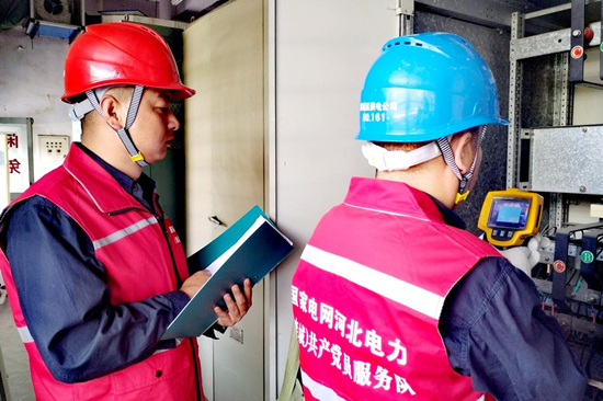 國網(wǎng)趙縣供電公司黨員服務(wù)隊隊員在趙縣中學(xué)檢查用電設(shè)施。 侯西果攝