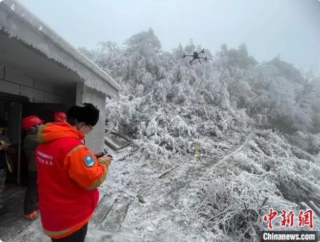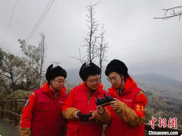 晉電援湘抗冰突擊隊隊員利用無人機觀察冰情。國網山西省電力公司供圖