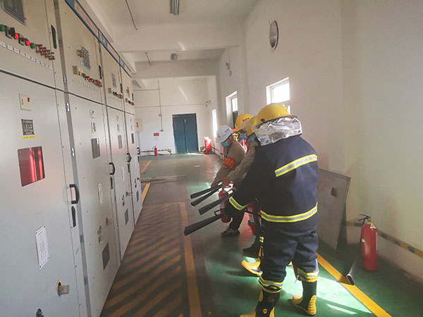 此次演練場景設(shè)置為模擬SVG連接變壓器341高壓開關(guān)柜著火,共場景11個。在總指揮交代運行方式、應(yīng)急組組長進行安全交底后,隨著生產(chǎn)樓辦公區(qū)域傳出刺耳的火警警報聲,演練正式開始。煙感報警裝置發(fā)現(xiàn)火情,應(yīng)急組長立即派人就地檢查發(fā)現(xiàn)341高壓開關(guān)柜下部冒出濃煙,判斷為開關(guān)出線電纜接頭放炮引起,隨即組織現(xiàn)場滅火、匯報集控中心和調(diào)度、撥打火警電話、啟動防火應(yīng)急響應(yīng)等一系列應(yīng)急措施迅速展開,全體參演人員穿上戰(zhàn)斗服,手提二氧化碳滅火器,迅速向開關(guān)柜內(nèi)噴入滅火劑,經(jīng)過數(shù)分鐘的撲救,在消防隊到來前將火撲滅,應(yīng)急組配合消防隊人員檢查現(xiàn)場是否有復燃可能,總指揮宣布解除應(yīng)急響應(yīng),演練結(jié)束。