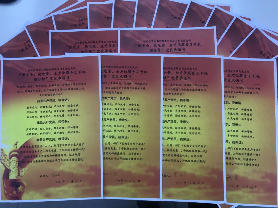 他們保證:堅決落實集團黨委、公司、部門下發(fā)的安全生產(chǎn)要求!堅決沖在安全生產(chǎn)、搶發(fā)電量、2號機組B修第一線!堅決發(fā)揮基層黨員的先鋒模范作用,以身作則!竭盡全力打贏單機安全運行及2號機組B修攻堅戰(zhàn)!