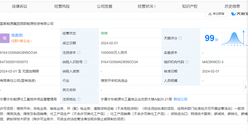 近日,國家能源集團西部能源投資有限公司注冊成立,位于寧夏回族自治區(qū)銀川市,法定代表人為張勝利,注冊資本100億人民幣。