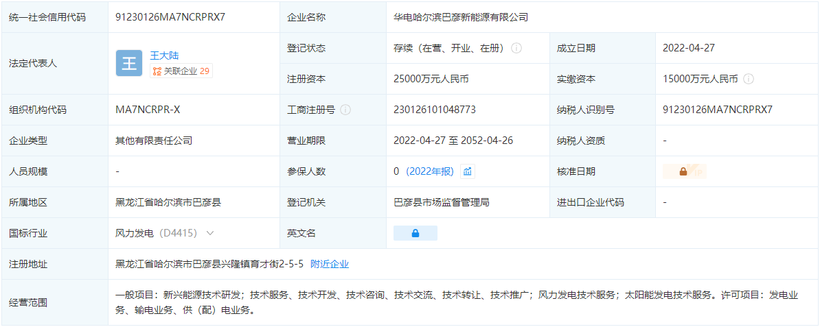 企查查顯示,4月28日,華電(哈爾濱)新能源有限公司成立,法定代表人為鄭勇斗,注冊資本1000萬人民幣,經營范圍含新興能源技術研發(fā)、風力發(fā)電技術服務、太陽能發(fā)電技術服務、儲能技術服務等。該公司由華電能源(600726)全資持股。