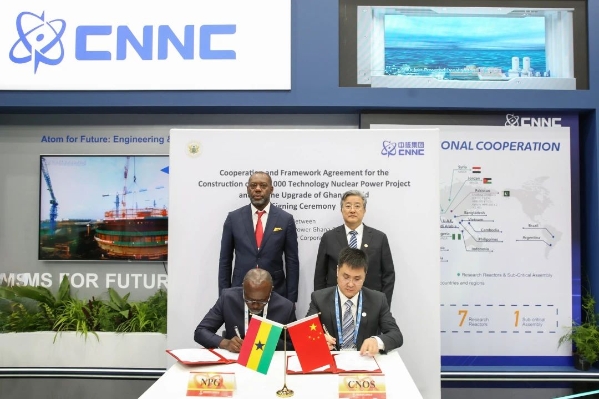 IAEA總干事拉斐爾·格羅西,世界能源理事會(huì)CEO安吉拉,WNA總干事薩瑪·萊昂,加納能源部長(zhǎng)馬修·普倫佩,馬拉維能源部長(zhǎng)易卜拉欣·馬托拉,法國(guó)原委會(huì)副主席皮凱蒂,加拿大核協(xié)會(huì)主席約翰·戈?duì)柭?,法?guó)電力公司董事長(zhǎng)呂克·雷蒙,國(guó)家能源局總經(jīng)濟(jì)師魯俊嶺、科技部中國(guó)國(guó)際核聚變能源計(jì)劃執(zhí)行中心副主任王敏、中國(guó)電力聯(lián)合會(huì)理事長(zhǎng)辛保安等中外領(lǐng)導(dǎo)嘉賓參觀了展臺(tái)。展會(huì)期間,中核集團(tuán)與加納能源部、法國(guó)電力集團(tuán)等重要合作伙伴進(jìn)行了雙邊會(huì)談。中國(guó)中原與加納核電公司簽署了核電項(xiàng)目合作框架協(xié)議。