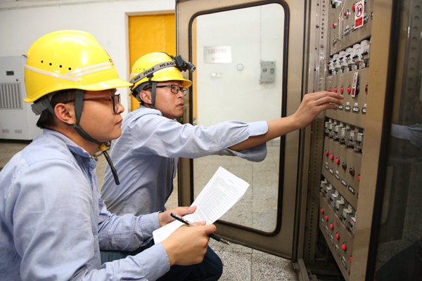 集控室里,還活躍著一批近幾年新進廠的集控小年輕。今年剛?cè)霃S的新員工肖煜亮放棄了假日,正在向師傅請教問題,對他來說假日也是他學習的好時光。2017年進廠的張濤和2018年進廠的龔家龍則跑到了380伏配電室,嚴格按照唱票復誦制,熟練的進行電氣停電操作。即便是在黃金周,他們也和前輩們一樣,不愿休息一天,只為盡心盡力保機組安全。