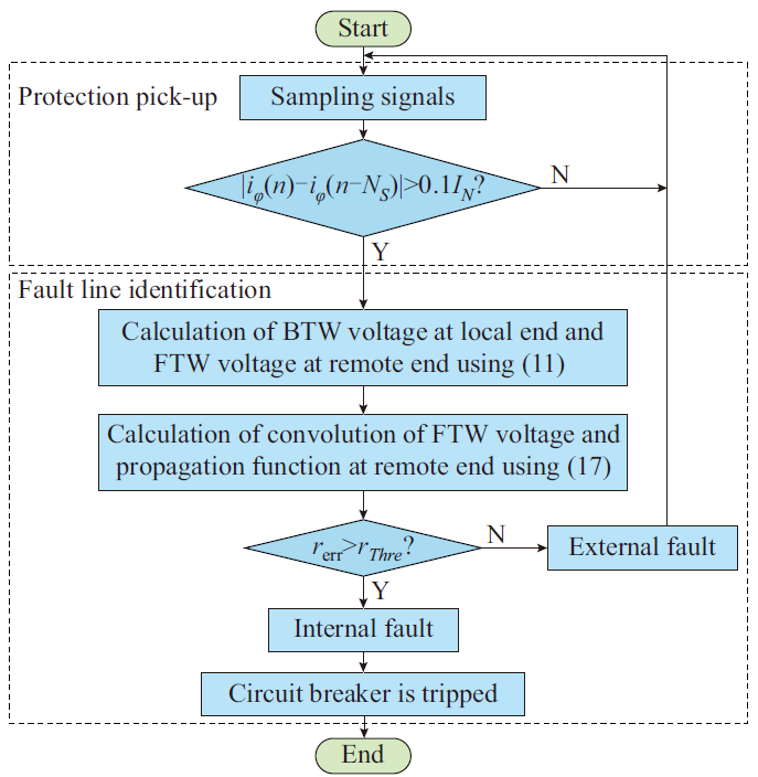 典型的換流器故障控制策略雖能弱化故障特征,但在故障暫態(tài)階段,故障特征主要受到海纜中電容和電感間能量交換的影響。同時(shí),換流器控制系統(tǒng)完成指定目標(biāo)需要一定時(shí)間,因此故障支路電流在故障暫態(tài)階段幅值較大并逐漸減小。充分利用該階段的故障信息,即可實(shí)現(xiàn)故障識(shí)別。鎧裝三芯海纜包含導(dǎo)芯、金屬屏蔽層和鎧裝,多導(dǎo)體之間存在電磁耦合,單獨(dú)分析相電氣量困難。對(duì)此,首先利用時(shí)域暫態(tài)信號(hào)相模變換,篩選出能夠反映各種故障類型的模量。Marti模型考慮了線路頻變特性,能夠根據(jù)對(duì)端電壓前行波準(zhǔn)確計(jì)算本端電壓反行波。為了在低采樣率下實(shí)現(xiàn)計(jì)算,推導(dǎo)了基于插值的高精度電壓反行波電壓表達(dá)式?;陔妷悍葱胁ú町惖暮I巷L(fēng)電低頻輸電系統(tǒng)海纜縱聯(lián)保護(hù)方案流程圖如圖2所示。保護(hù)啟動(dòng)后,首先根據(jù)本端模量信息計(jì)算本端電壓反行波,然后通過對(duì)端電壓前行波與傳播函數(shù)間的卷積來計(jì)算本端電壓反行波,最終比較二者差異以實(shí)現(xiàn)海纜保護(hù)。