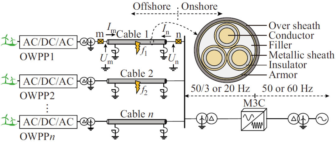 圖1給出了海上風(fēng)電低頻輸電系統(tǒng)拓?fù)?,海纜需匯集來自于風(fēng)電場的電能,并經(jīng)模塊化多電平矩陣換流器(modular multilevel matrix converter,M3C)實(shí)現(xiàn)頻率轉(zhuǎn)換,從而在M3C低頻側(cè)構(gòu)成了100%電力電子源場景。相較于同步機(jī)系統(tǒng)在負(fù)序網(wǎng)絡(luò)中源側(cè)只體現(xiàn)阻抗特性,低頻輸電系統(tǒng)負(fù)序網(wǎng)絡(luò)中線路兩側(cè)均可體現(xiàn)為電源特性。根據(jù)單相接地故障和兩相相間故障復(fù)合序網(wǎng)圖,故障支路電流可由負(fù)序電流唯一確定,當(dāng)M3C和海上風(fēng)電場網(wǎng)側(cè)變流器(grid-side converter, GSC)抑制負(fù)序電流時(shí),盡管故障點(diǎn)處存在負(fù)序電壓源,但兩側(cè)換流器均會(huì)生成幅值相位相同的電壓源,以抵消系統(tǒng)中的負(fù)序電流,因此系統(tǒng)故障電流仍保持對(duì)稱,使得故障支路的穩(wěn)態(tài)電流為0。上述分析表明,雖然風(fēng)電場升壓變壓器和M3C低頻側(cè)隔離變壓器網(wǎng)側(cè)中性點(diǎn)均采取直接接地方式,但低頻輸電系統(tǒng)在特定故障控制策略下呈現(xiàn)出類似于中性點(diǎn)非直接接地系統(tǒng)的故障特征。