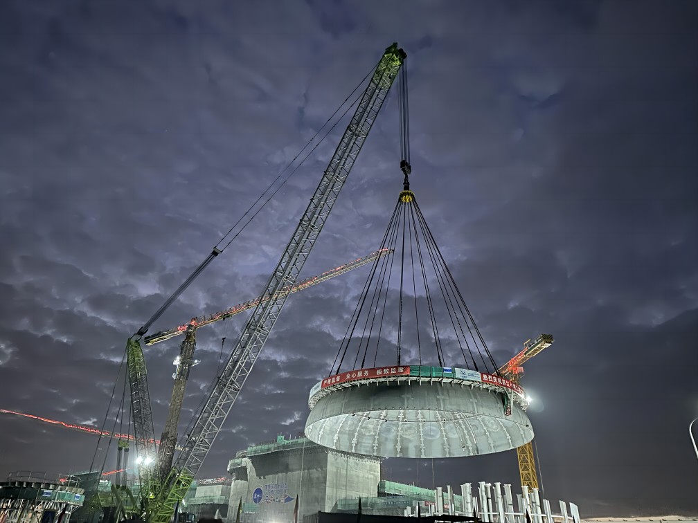 11月3日,中核集團宣布海南多用途模塊式小型堆科技示范工程“玲龍一號”鋼制安全殼頂封頭順利吊裝就位,標(biāo)志著全球首個開工建造的模塊式小型示范堆的關(guān)鍵結(jié)構(gòu)封頂,全面進入內(nèi)部安裝高峰期。這次吊裝完成了鋼制安全殼形成整體的最后一步,為已經(jīng)先期引入的反應(yīng)堆核心模塊、堆內(nèi)構(gòu)件、穩(wěn)壓器等重要設(shè)備提供了更加完整、可靠的保護屏障。