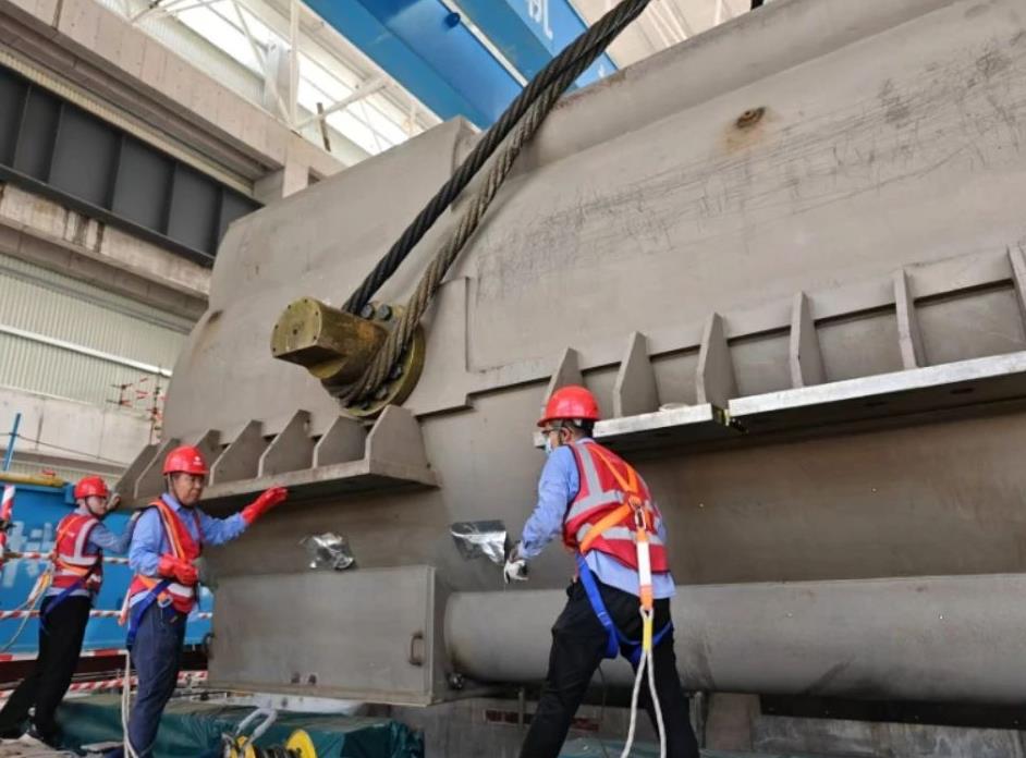 發(fā)電機(jī)定子作為主廠房內(nèi)最重的單體設(shè)備,長10.3米、寬4.868米、高4.7米,重達(dá)367噸。為確保發(fā)電機(jī)定子吊裝平穩(wěn)、就位精準(zhǔn),項(xiàng)目建設(shè)團(tuán)隊(duì)組織制定詳細(xì)的吊裝施工方案,提前做好設(shè)備和工器具保障,從場外運(yùn)輸至場內(nèi)卸車全過程反復(fù)推演,逐項(xiàng)落實(shí)。同時(shí),在吊裝期間實(shí)施全程監(jiān)督,嚴(yán)控安全質(zhì)量,確保整個(gè)吊裝過程安全、有序、可控。