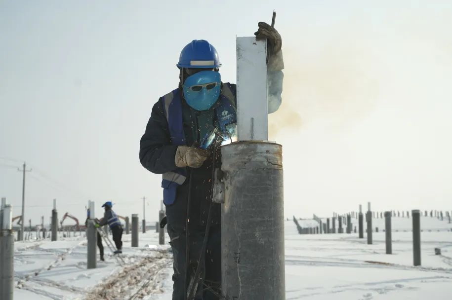 茫茫的沙海里,迎著凜冽寒風(fēng),踩在厚厚的積雪里,項(xiàng)目經(jīng)理李超翔和土建經(jīng)理張國睿的鞋子已濕透了,他們和施工單位、監(jiān)理單位值班人員一起,一如往常,一絲不茍地堅(jiān)守在崗位上,仔細(xì)地檢查著預(yù)制管樁校準(zhǔn)、焊樁頭和裝支架的工程質(zhì)量,叮囑施工人員要把控好安全和質(zhì)量。