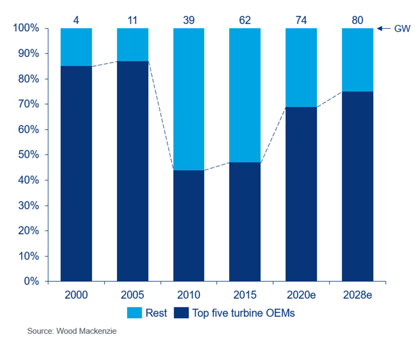 根據(jù)伍德·麥肯齊(Wood Mackenzie)的最新研究,到2028年,領(lǐng)先的三大風(fēng)力渦輪機(jī)原始設(shè)備制造商的市場(chǎng)份額將從2019年的47%(即32GW)增長(zhǎng)到60%以上(即48GW)。
