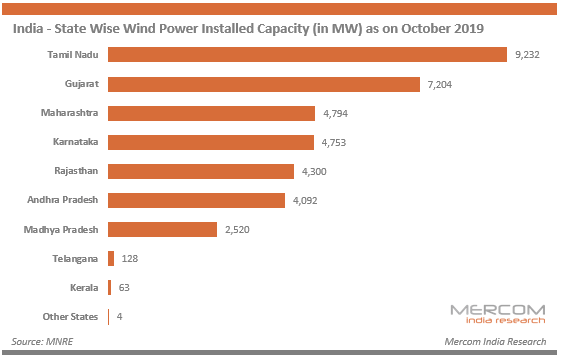 政府設定了到2022年安裝60 GW風力發(fā)電能力的目標。根據MNRE,印度的累計風力發(fā)電安裝量已突破37 GW大關,到2019年10月為37,090.03 MW。