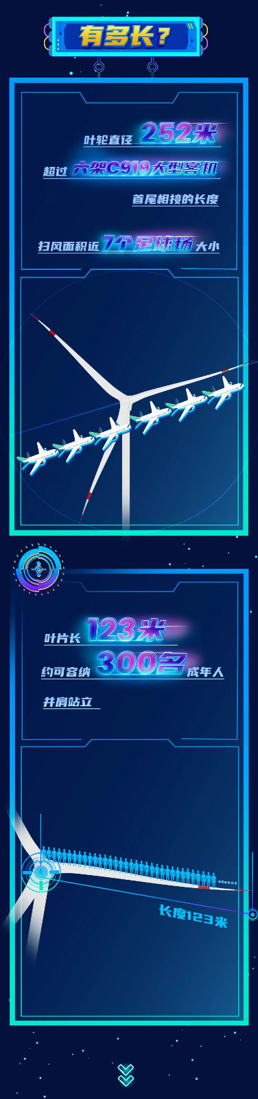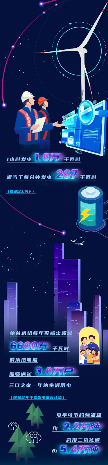 此次下線的單機容量16兆瓦海上風電機組,葉輪直徑252米,葉輪掃風面積約5萬平方米,約相當于7個標準足球場大;輪轂高度達146米,約相當于一座50層大樓的高度。在額定工況下,單臺機組每轉(zhuǎn)動一圈可發(fā)電34.2千瓦時。根據(jù)多年平均發(fā)電量設(shè)計值,單臺機組每年可輸出超過6600萬千瓦時的清潔電能,能夠滿足3.6萬戶三口之家一年的生活用電,可節(jié)約標煤約2.2萬噸,減排二氧化碳約5.4萬噸。
