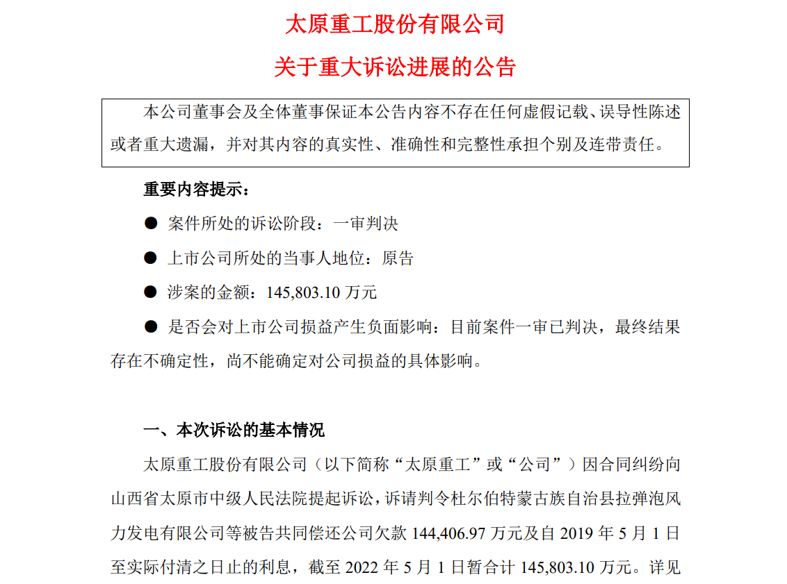公告披露,太原重工因合同糾紛向山西省太原市中級人民法院提起訴訟,訴請判令杜爾伯特蒙古族自治縣拉彈泡風力發(fā)電有限公司(以下簡稱“拉彈泡公司”)等被告共同償還公司欠款144,406.97萬元及自2019年5月1日至實際付清之日止的利息,截至2022年5月1日暫合計145,803.10萬元。