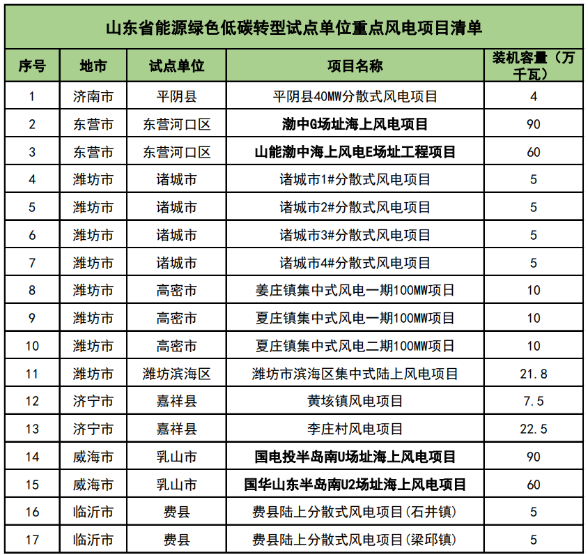 同時,該文件還公布了山東省能源綠色低碳轉型試點單位重點項目清單。清單包含24個風電項目,總裝機容量785.1萬千瓦,其中海上風電項目共計4個,總裝機容量300萬千瓦。