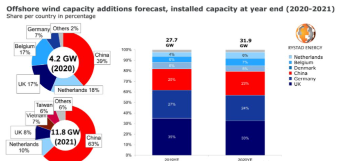 根據(jù)知名能源咨詢公司Rystad Energy數(shù)據(jù)統(tǒng)計(jì),盡管受新冠疫情影響,2020年全球海上風(fēng)電新增裝機(jī)4.2GW,同比增長15%,總裝機(jī)達(dá)到31.9GW。同時(shí),該機(jī)構(gòu)預(yù)測今年全球?qū)⑿略鲅b機(jī)11.8GW,同比增長37%,最終裝機(jī)達(dá)到43.7GW。