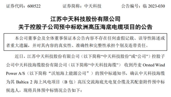中天科技稱,本次預(yù)中標(biāo)項目的金額占其公司2022年度經(jīng)審計營業(yè)收入的3.00%,對公司未來經(jīng)營業(yè)績將有積極影響。中天科技海纜將以此為新的契機,進一步深耕歐洲海風(fēng)市場,為全球海上風(fēng)電建設(shè)、海洋能源勘探提供穩(wěn)定可靠的技術(shù)支撐及創(chuàng)新引領(lǐng)。