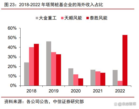 國(guó)內(nèi)企業(yè)塔筒出海勢(shì)頭加速,單樁出口實(shí)現(xiàn)突破。大金重工、天順風(fēng)能、泰勝風(fēng)能的 出口比例接近,國(guó)內(nèi)企業(yè)以出口塔筒產(chǎn)品為主,海外客戶的供應(yīng)商體制使有出口業(yè)績(jī)的公 司具備更好的客戶端優(yōu)勢(shì);樁基因運(yùn)輸效率低和方案不成熟的問(wèn)題,需求仍主要由海外本 地產(chǎn)能滿足。根據(jù)大金重工公告,公司憑其基礎(chǔ)設(shè)施、港口條件和工藝裝備和對(duì)海外業(yè)務(wù) 的加大投入,于 2022 年攬入 6 項(xiàng)海風(fēng)海外項(xiàng)目,包括 5 項(xiàng)歐洲項(xiàng)目,成為國(guó)內(nèi)首家管樁 產(chǎn)品出口歐洲的企業(yè),打開國(guó)產(chǎn)樁基的歐洲市場(chǎng)。
