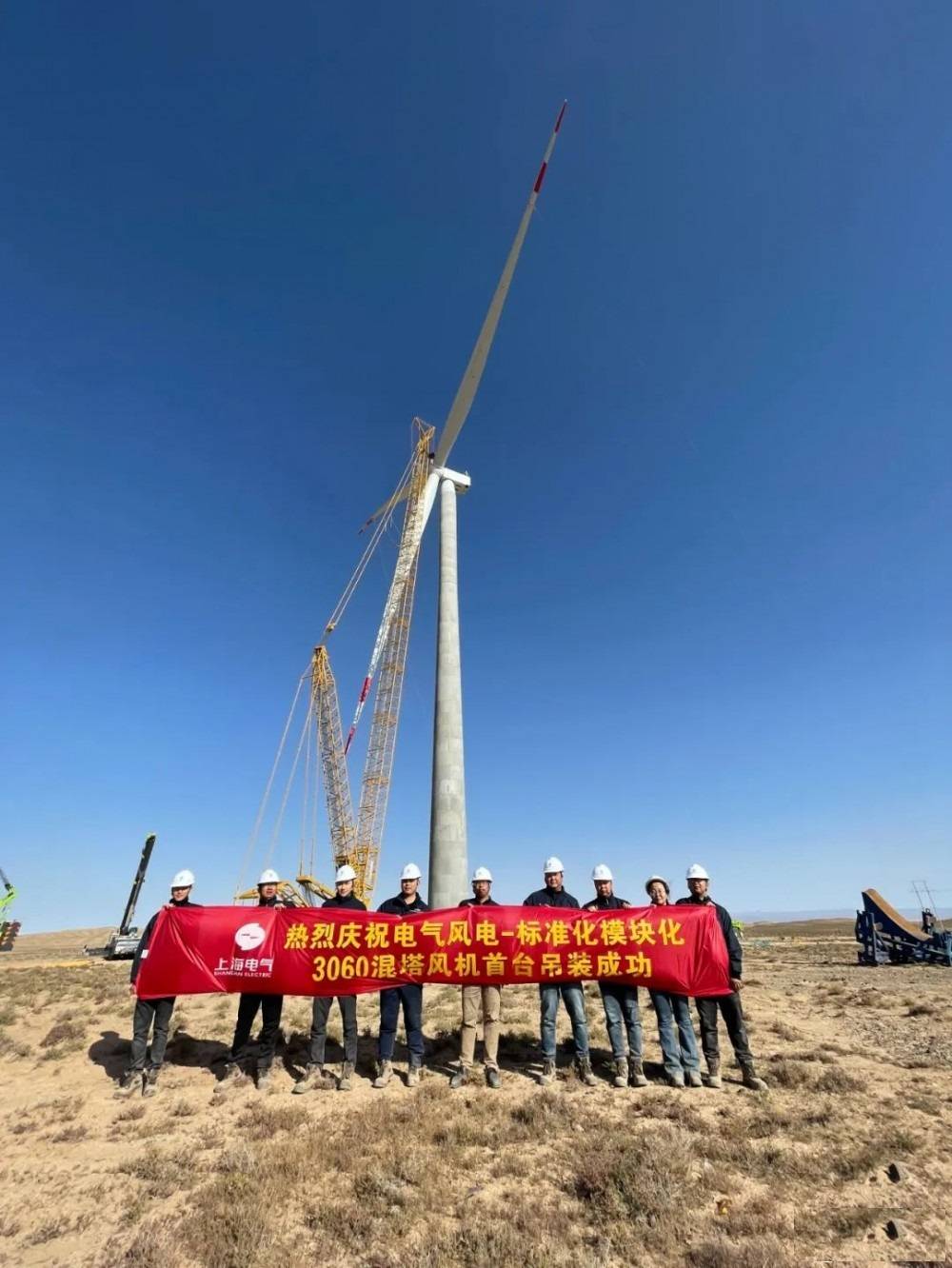 近年來,混塔(鋼-混凝土混合塔架)憑借著剛度大、安全穩(wěn)定性高、原材料成本低等各項(xiàng)優(yōu)勢(shì)在風(fēng)切變指數(shù)較高的低風(fēng)速地區(qū)得到了廣泛應(yīng)用,為用戶帶來了明顯的收益、得到了用戶的普遍認(rèn)可。2022年10月21日,電氣風(fēng)電首臺(tái)自研自制的標(biāo)準(zhǔn)化、模塊化“3060混塔”型風(fēng)電機(jī)組卓刻平臺(tái)WH6.25N-182,在甘肅省金昌市潮水山戈壁灘順利完成吊裝。該機(jī)組的順利吊裝標(biāo)志著:電氣風(fēng)電自研混塔正式進(jìn)入批量商業(yè)化應(yīng)用階段。