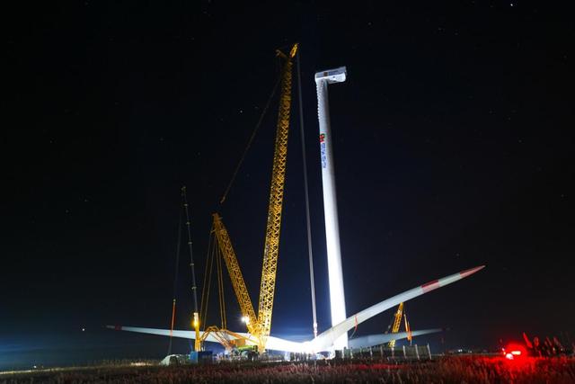 施工過程中,項(xiàng)目團(tuán)隊(duì)充分發(fā)揮“嚴(yán)、細(xì)、實(shí)”的工作作風(fēng),時(shí)刻關(guān)注天氣變化,克服了本年度首輪寒潮和大雪的影響,緊密協(xié)同、高效配合,通過科學(xué)施工組織、周密作業(yè)準(zhǔn)備、嚴(yán)格質(zhì)量檢驗(yàn),機(jī)艙和葉輪在連續(xù)施工40小時(shí)后成功對(duì)接,圓滿完成首臺(tái)風(fēng)機(jī)吊裝作業(yè)。