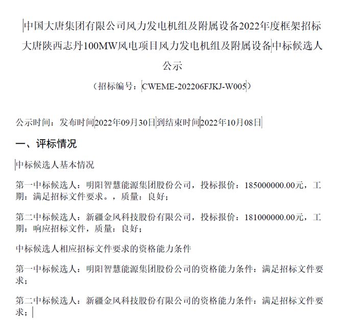 9月30日,中國大唐集團(tuán)有限公司風(fēng)力發(fā)電機(jī)組及附屬設(shè)備2022年度框架招標(biāo)大唐陜西志丹100MW風(fēng)電項(xiàng)目風(fēng)力發(fā)電機(jī)組及附屬設(shè)備中標(biāo)候選人公示,明陽智能預(yù)中標(biāo),投標(biāo)報(bào)價(jià)18500萬元。