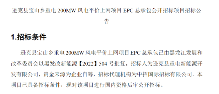 公告顯示,遜克縣寶山鄉(xiāng)重電200MW風電平價上網(wǎng)項目位于黑龍江省黑河市遜克縣寶山鄉(xiāng)境內,場址中心距遜克縣城直線距離約50km,規(guī)劃裝機總容量為200MW,一次性建設完成,風電場擬安裝32臺H193-6.25MW機型。
