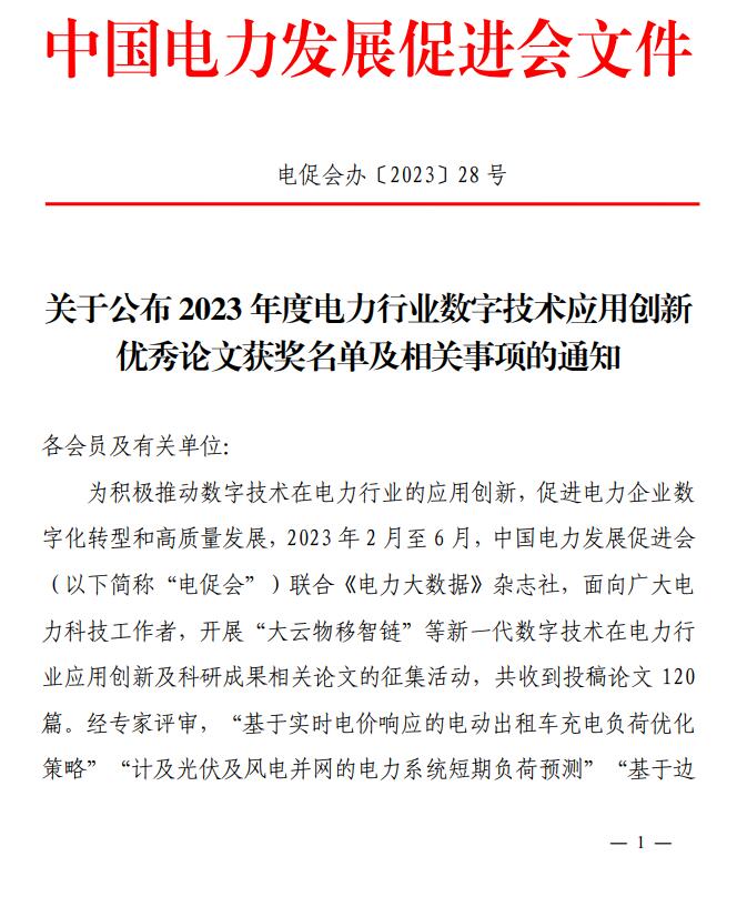 關(guān)于公布2023年度電力行業(yè)數(shù)字技術(shù)應用創(chuàng)新優(yōu)秀論文獲獎名單及相關(guān)事項的通知